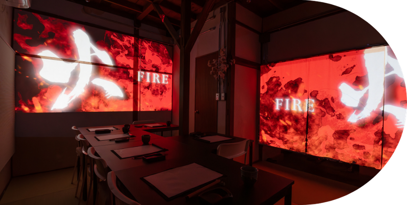 アトリエの壁一面に広がる映像の世界へ。日本の風景を巡り、水墨画の幻想的な世界に浸る約5分間。
